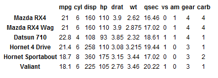 | **Mazda RX4 Wag** | 21 | 6 | 160 | 110 | 3.9 | 2.875 | 17.02 | 0 | 1 | 4 | 4 |