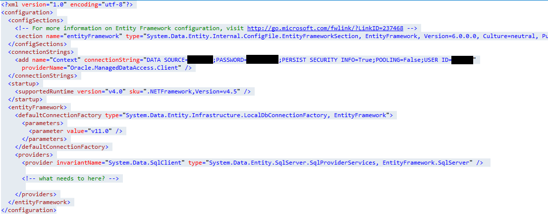 另外,将Oracle.ManagedDataAccess.Client提供程序添加到配置/实体框架/提供程序标记中。