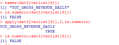 apply(dat3[varlist[9]],2,is.numeric)我得到了结果为TRUE的字段名的确认,但是当我尝试作为is.numeric(dat3[varlist[9]])进行测试时,结果会收到一个FALSE。