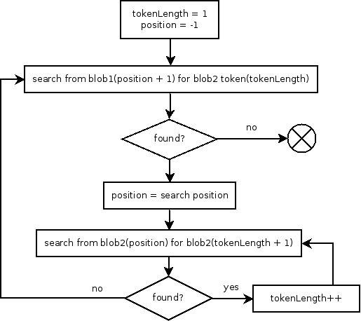 我不知道这是否是解决这个问题的最佳算法(我肯定,这不是),但是,我想这是一个很好的算法。这个想法很简单,从blob2在blob1中搜索最低令牌开始。当您找到匹配时,试着看看是否可以在此位置匹配较大的令牌。如果这是正确的,更新您的令牌长度。