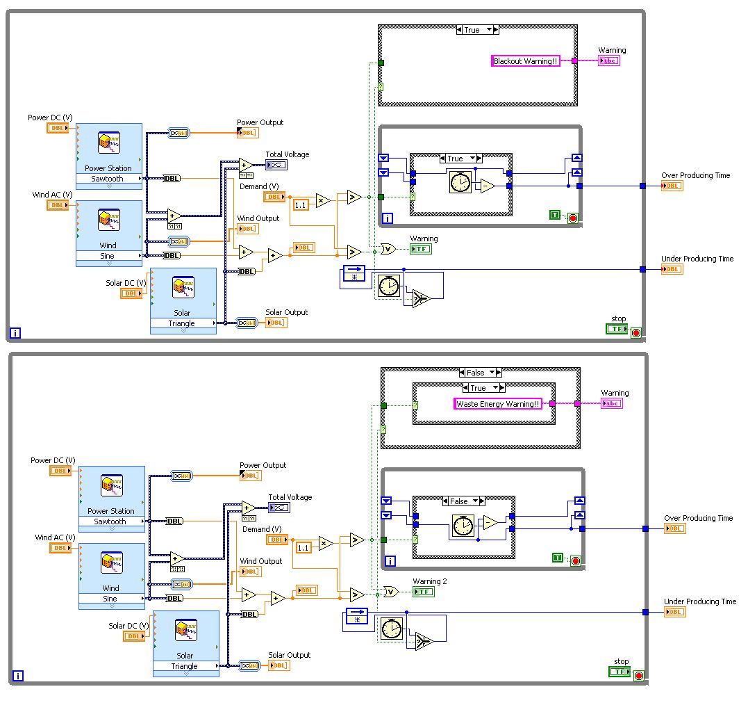 我一直在为孩子们制作一个labview程序来监控各种能源的能源生产。我有一个条件,如果他们生产不足的警告会开火,如果他们的生产超过一个证明门槛,另一个警告会开火。我想在整个活动中花多长时间,每种类型的警告都会被触发,这样每个小组在结束时都会有一个分数。这只是为了模拟最终程序的行为。目前,我有一个计时器,它可以消除警告的时间是真实的,但它会覆盖自己,每次警告一次又一次。