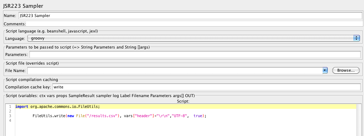 进口org.apache.commons.io.FileUtils; FileUtils.write(新文件(“/results.csv”),vars"header"+"\r\n","UTF-8",true);