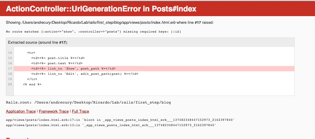在我包含"show“链接( <% = link_to 'Show',post_path%> )之后,在”更新5:12帖子“一章中,出现了一个错误。(图像)