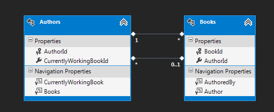 [ForeignKey("CurrentlyWorkingBookId"), InverseProperty("EditoredBy")] public Book CurrentlyWorkingBook { get; set; }