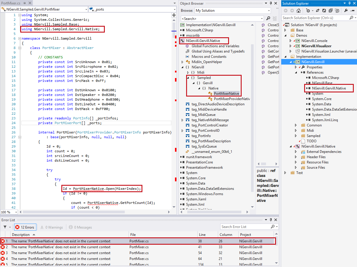 引用托管C++项目(NGervill.Gervill.Native),根据对象浏览器,它包含所有必需的命名空间和类型。在我的源代码中,我添加了using并使用了这个类,但是仍然得到了一个编译错误。