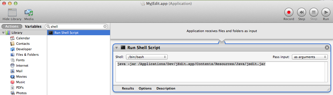 因此,我使用Automator创建了一个名为“MacOS”的普通MyJEdit.app应用程序,如屏幕截图中所示。现在我可以启动MyJEdit而不是jEdit了。可能需要其他java标志,例如设置内存使用情况(cf、java -help和java -X)。
