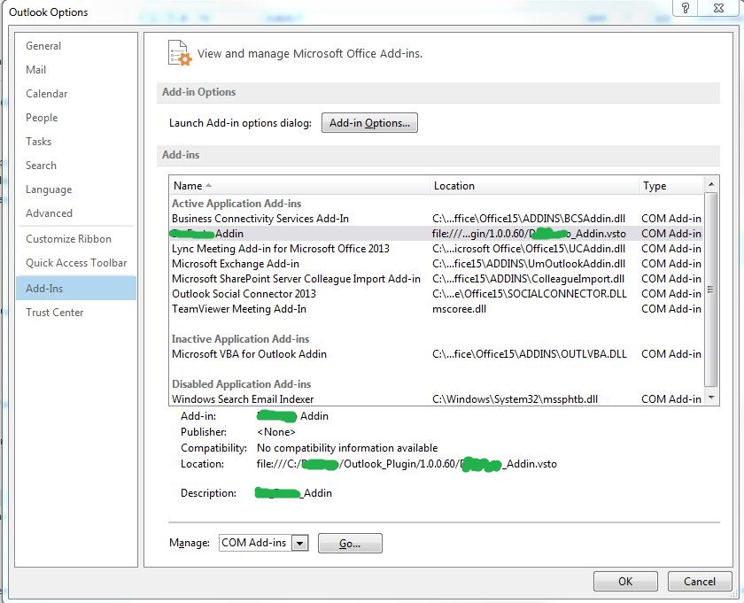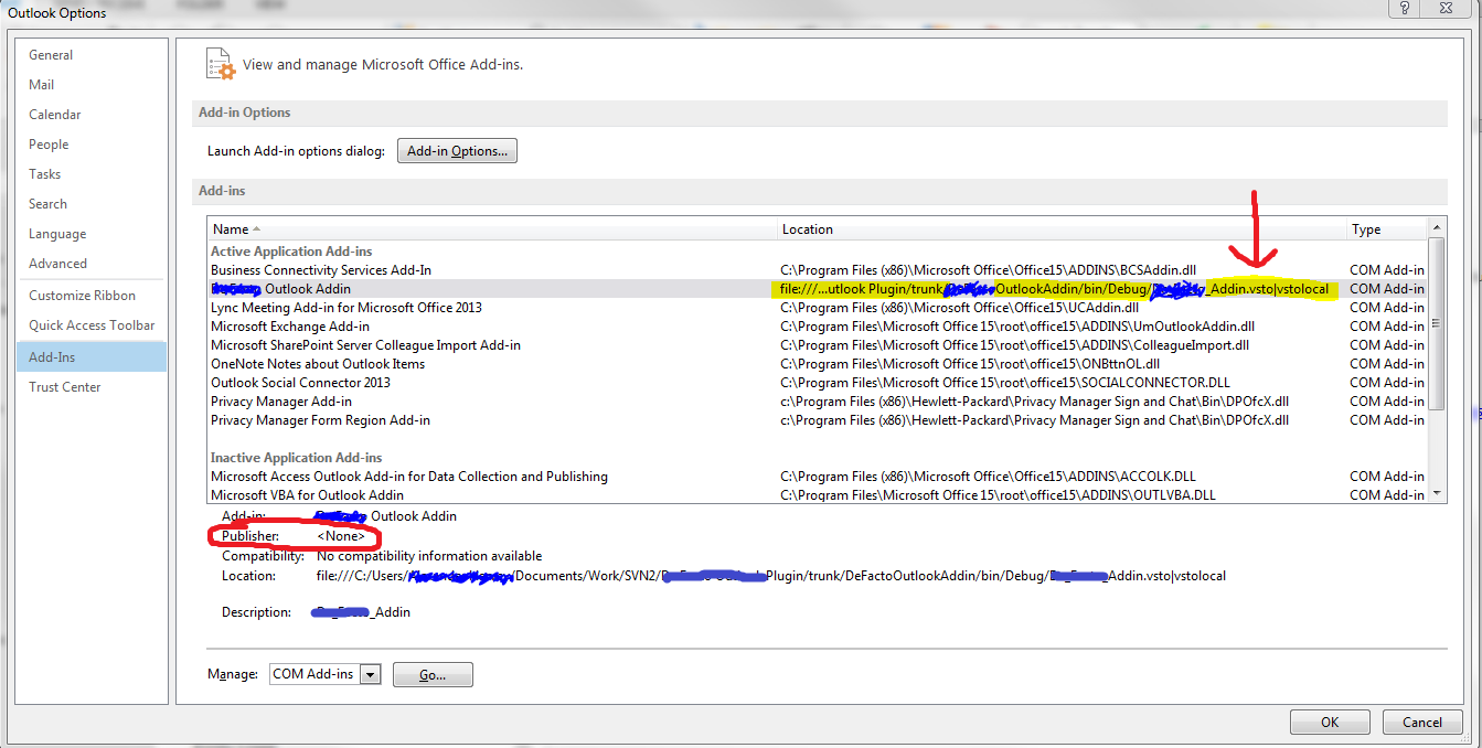 我的第一个问题是,当我安装我的外接程序时,Outlook选项中的位置指向的是vsto文件,而不是.Dll文件。我需要它安装到默认的outlook目录中,并引用.dll而不是vsto文件。