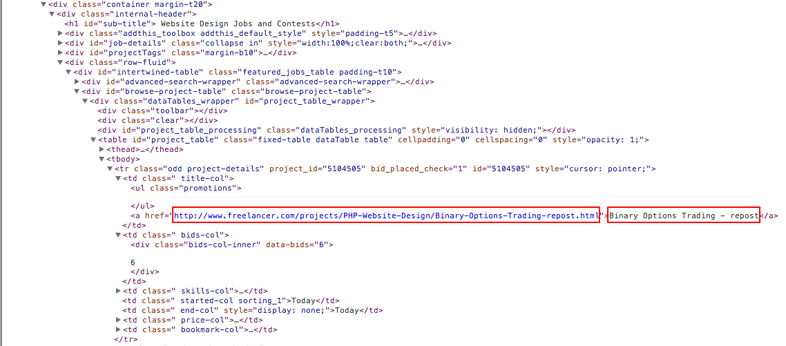 对于一个大学项目,我正在创建一个带有一些后端算法的网站,为了在演示环境中测试这些算法,我需要大量的假数据。为了获得这些数据,我打算刮一些站点。其中一个站点是freelance.com.To,我使用简单的HTML提取数据,但到目前为止,我在实际获取所需数据的努力中没有成功。