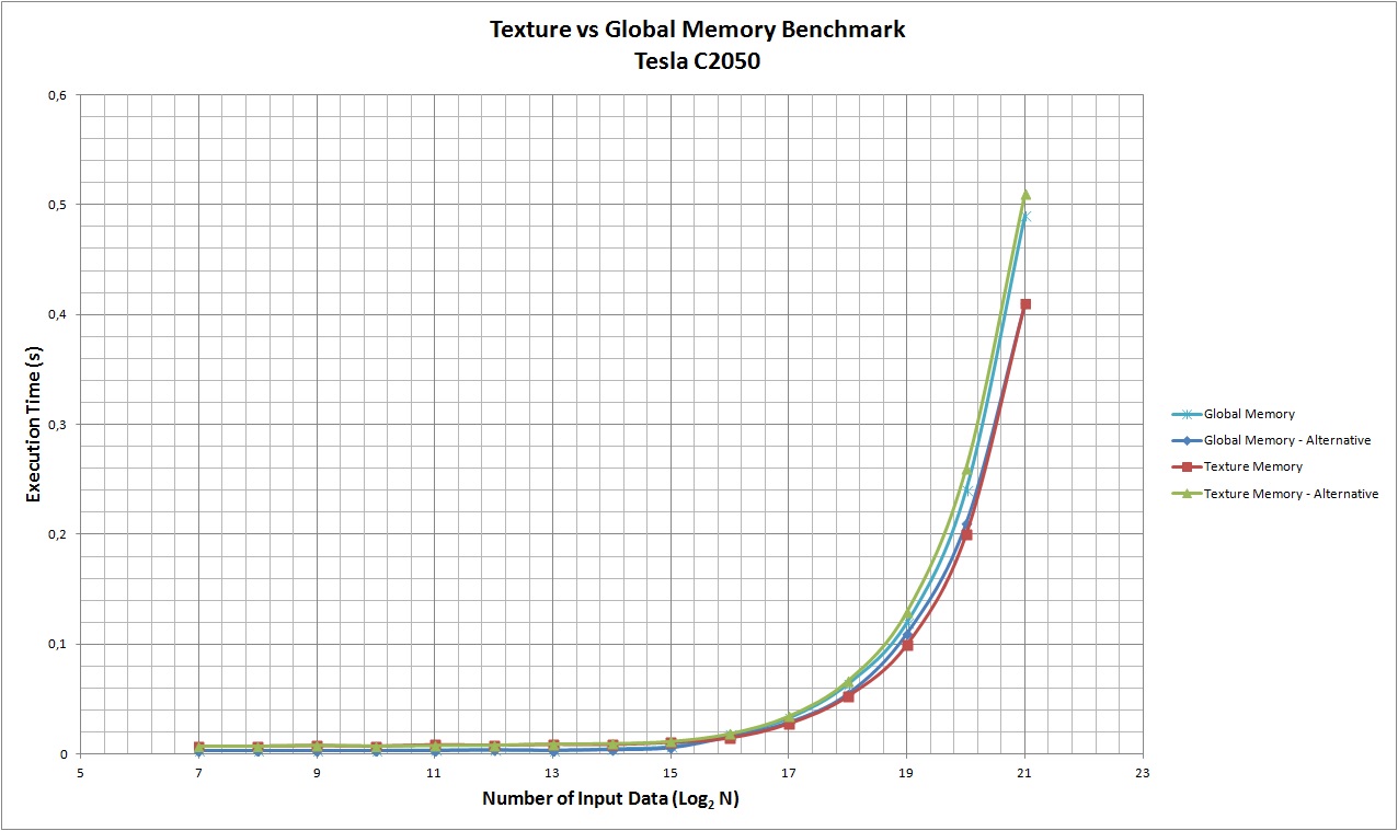 }我考虑了4种不同的GPU,即GeForce GT540M (cc 2.1)、Tesla C2050 (cc 2.0)、开普勒K20c (cc 3.5)和GT210 (cc 1.2)。结果见下表。可以看出,与使用全局内存相比,使用纹理作为缓存具有更老的计算能力,而这两种解决方案对于最新的体系结构来说是相当等效的。