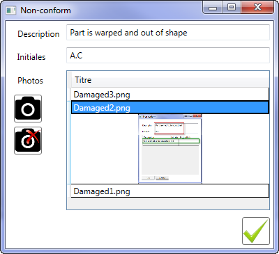 您在DataGrid上看到的文本框是my DamagedItemModel (Description、Initiales、PicturesList)的属性。因此,当用户单击Accept (Checkmark)按钮时,将DamagedItem添加到DamagedItemsList中,然后将其设置为来自my MainWindow的DataGrid的ItemSource: