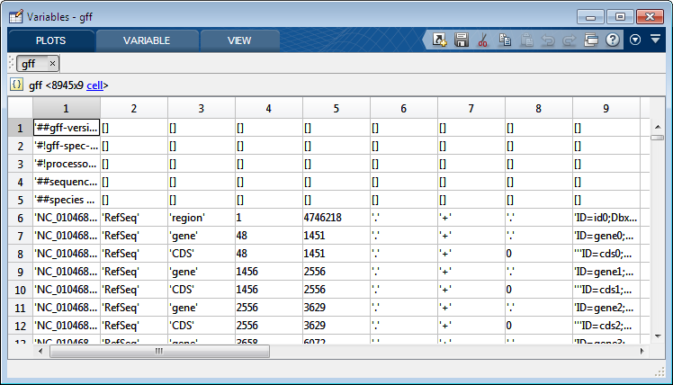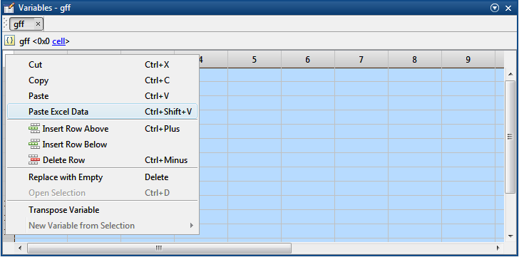 首先,在命令行gff={};上运行,生成一个空的cell数组。然后双击Workspace选项卡中的gff变量以获得上面的编辑器窗口。单击表格左上角的regino方块,选择所有单元格,然后右击以获得显示的菜单,并粘贴数据。如果粘贴工作正常(实际上可能需要几分钟--检查CPU的使用情况),那么您应该得到以下结果: