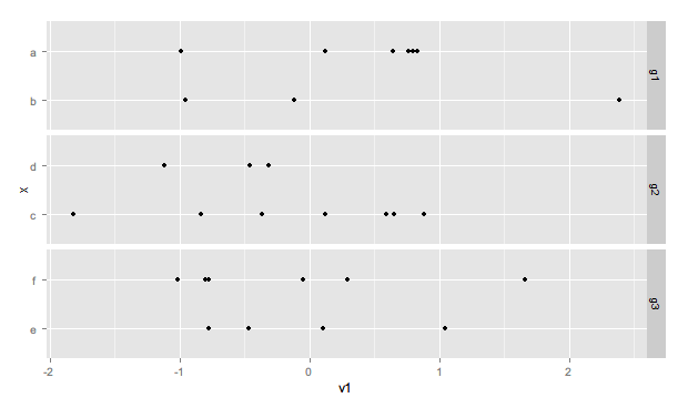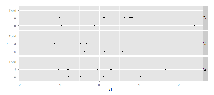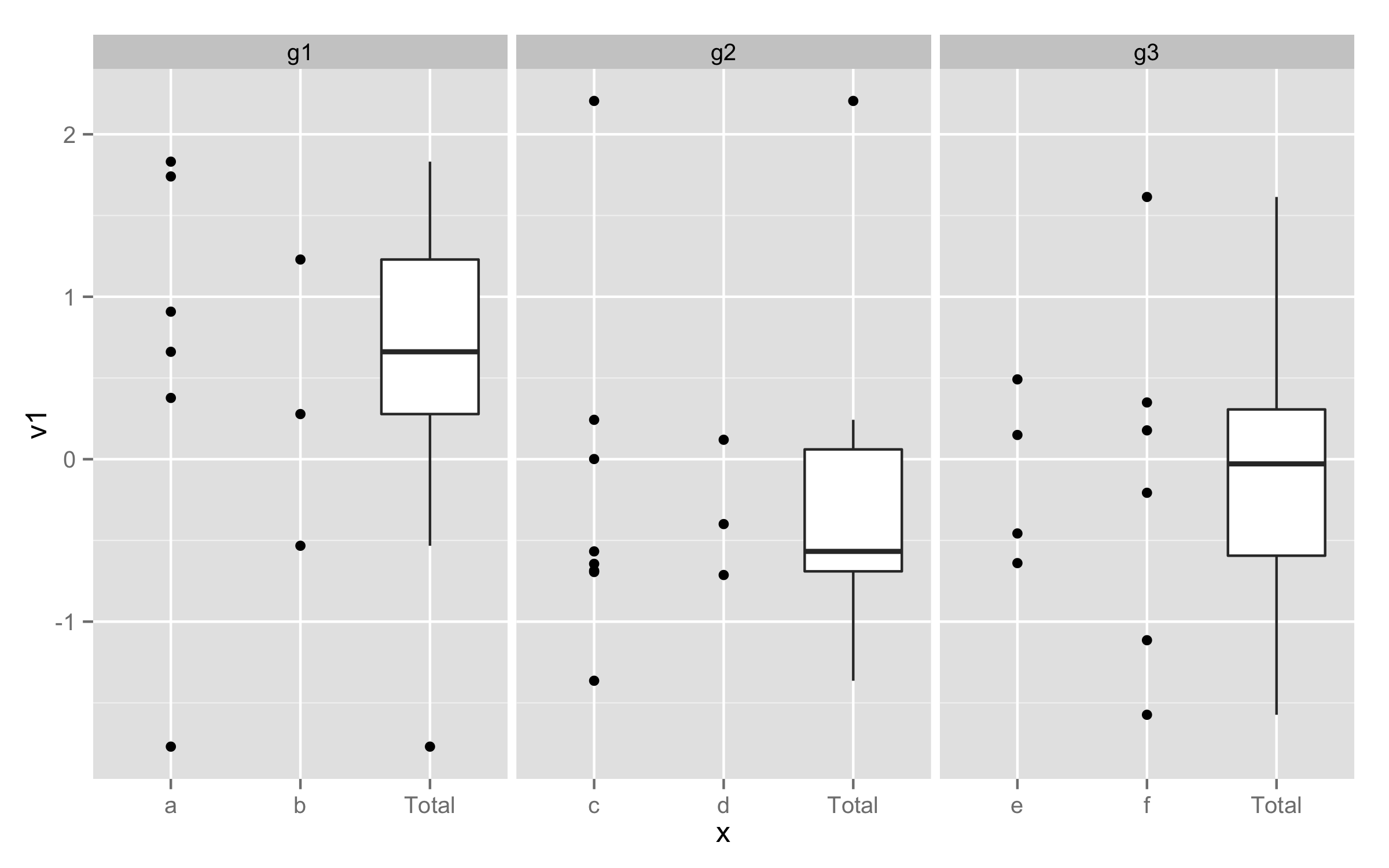 d2$x <- "Total"然后使用d1来生成点,使用d2来生成方格图。下面是框图垂直对齐的例子,其中x值被用作x。问题是要有水平的盒形图,就必须使用coord_flip()。翻转轴和自由鳞片不能一起使用。