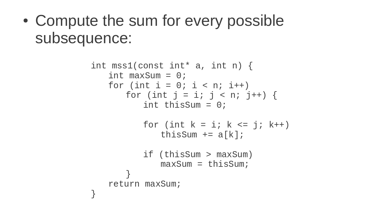 大家好,我试着计算最大子序列和的时间复杂度。实际上,我知道的答案是O (n^3 ),它是从函数(n^3+ 3n^2 + 2n)/6得到的。