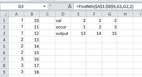 Function FindNth(Table As Range, Val1 As Variant, Val1Occrnce As Integer, ResultCol As Integer)