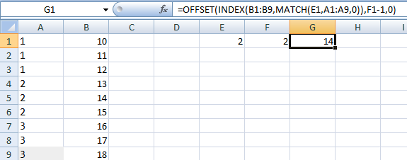 如果您的数据按示例中的数据排序,即。第一列上升,然后第二列上升。然后,您可以使用OFFSET()、INDEX()和MATCH()的组合。