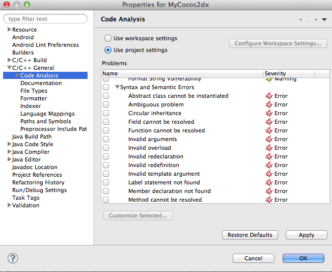 还有一件事,就是转到Projectproperty、int和codeAnalysis(在C/c++ Gneral中),然后单击use,设置取消标记的SYantax和语义错误复选框。它将删除大量的错误。