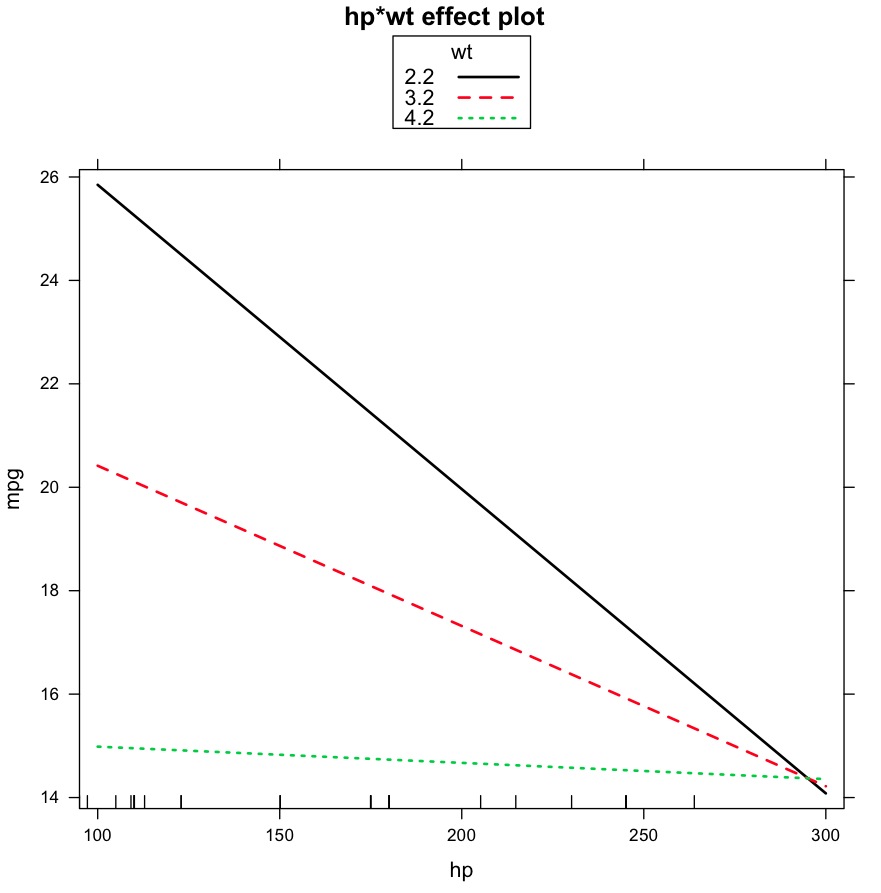 model <- lm(mpg ~ hp + wt + hp:wt, data=mtcars)