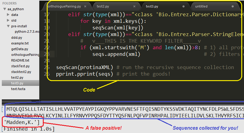 print(seqs) # print the goods!注意:在罕见的情况下(取决于“关键字筛选器”),它可能幽默地抓取不想要的字符串,比如作者名,以'M‘开头,其缩写名称超过10个字符长(下图):