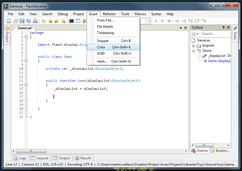 如果您使用FlashDevelop (无论如何都应该用于AS3开发),则菜单中有一个插入颜色选项。