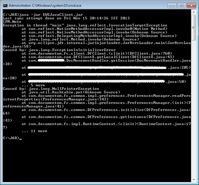 这个链中的最后一个例外是NullPointerException。这就是你需要解决的问题。这意味着您需要调试这个com.documentum。正如评论指出的那样,这并不是一件容易的事。