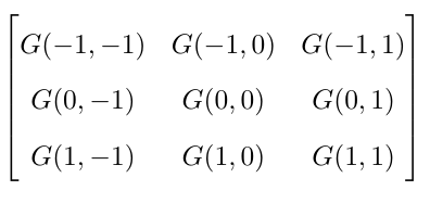 如果矩阵维数为3x3 (nxn),则系数k为1(因为高斯函数为-k,.,0,.,k,在本例中:-1,0,1,这就是维数为3的原因)