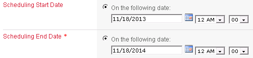 对于调度开始日期,将默认值设置为“今日日期”。对于调度结束日期,请将=DATE(YEAR(Today)+1,MONTH(Today),DAY(Today))的计算值用于默认值。