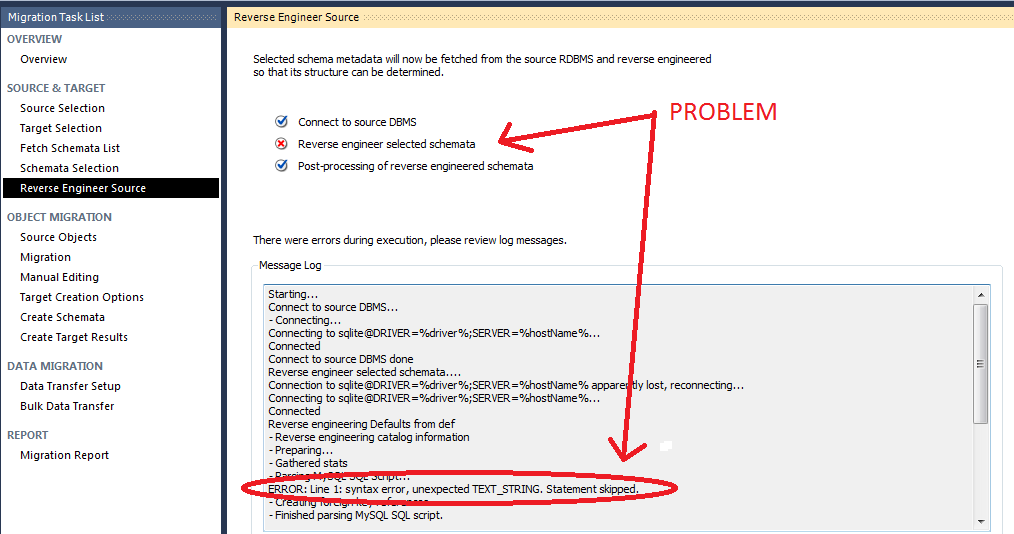但是,在迁移的反向工程阶段会产生一个错误(参见图2)。在本例中,错误内容为" error :第1行:语法错误,意外的TEXT_STRING.语句跳过“。因为反向工程因错误而终止,所以架构不是反向工程。