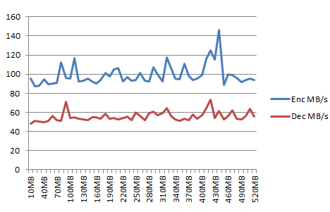我之所以问这个问题,是因为我想知道我所拥有的实现的解密速度是否异常缓慢。我在不同大小的随机内存块上做了一些测试。结果如下: