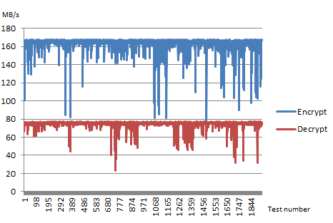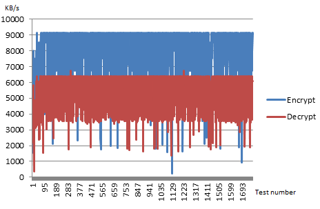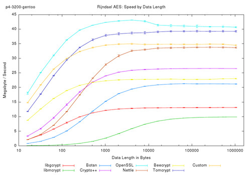 有三四件事突然出现在我面前。我有点同意@JamesKPolk --数字看不见了。首先,密码库通常采用CTR模式,而不是CBC模式。还可以看到超基准。任何你必须使用循环每字节(cpb)来标准化测量单位跨机器.在没有上下文的情况下说“9MB/s”没有任何意义。