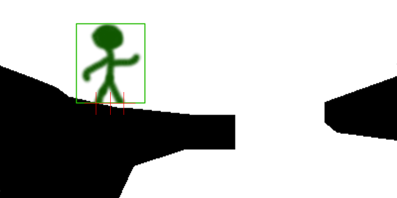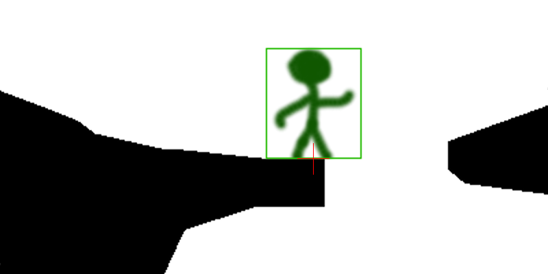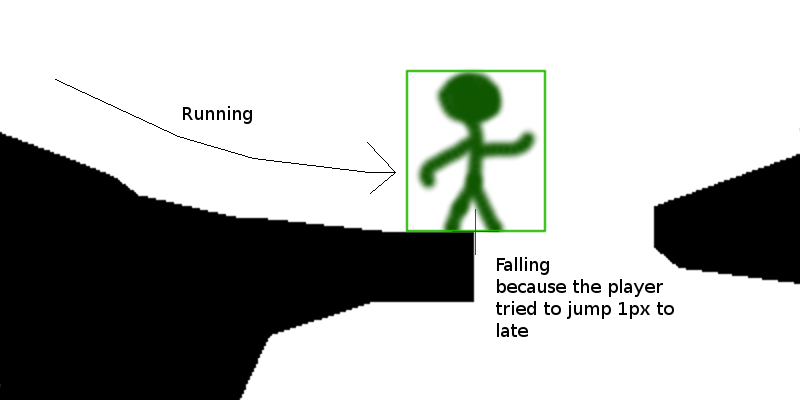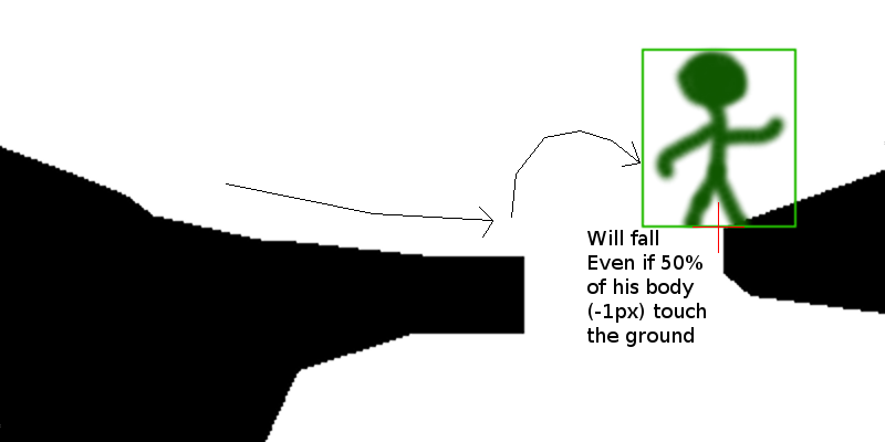 但是,如果玩家跑向右边,跳到1像素太晚了(太晚了意味着:当热点不在黑色像素= Texture.Width / 2 - 1之上时),玩家就不能跳下去,并且会掉下来。即使他50%-1倍的身体接触到了世界。这就是问题所在。
