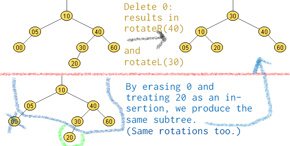 }所以我的问题是:我想实现AVLTree::Delete(AVLTreenode *n)。如果您删除AVLTree中的一个节点,我可以将删除()减少为插入()情况,并调用restoreAVL(),其中一些节点集为newNode,一个节点集为祖先?,我可以回收RestoreAVL(),而不是绞尽脑汁地思考每一个可能的结果吗?