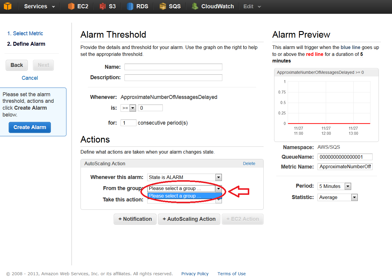 我最近也经历过同样的问题。如果没有以前创建的缩放策略,自动缩放组将不会出现在警报表单中。以下是我所做的步骤: