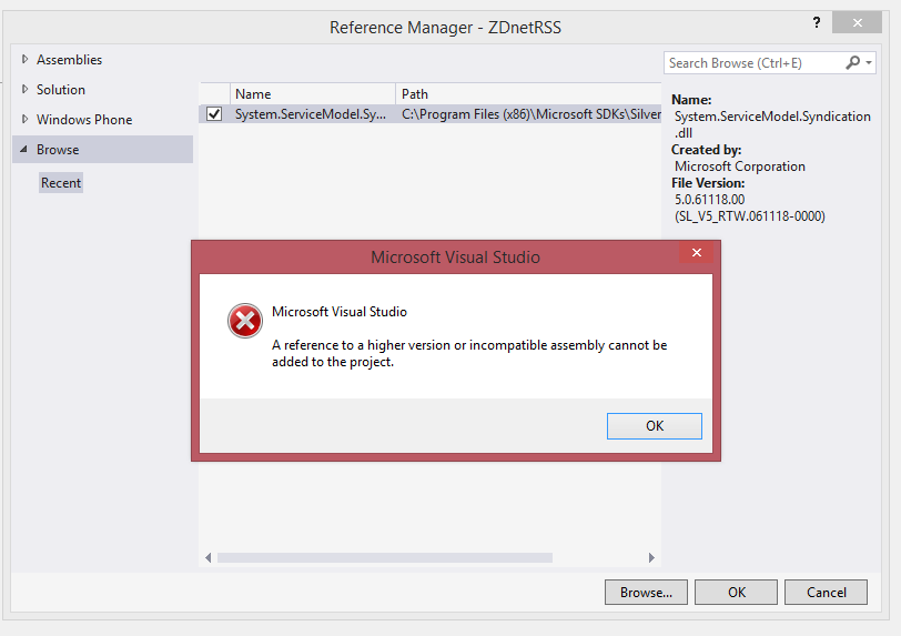 我正在尝试构建一个rss提要应用程序。我想加入System.Servicemodel.Syndication。但是,当我试图添加时,它是说不能将对更高版本或不兼容程序集的引用添加到项目中。在阅读了一些关于如何解决这个问题的帖子之后,我试着解除程序集的阻塞,但是我没有找到解锁按钮。这意味着该项目已被解除阻塞。那么我该如何解决这个问题呢?有没有其他方法可以阅读rss?
