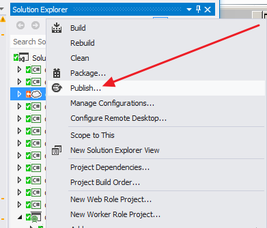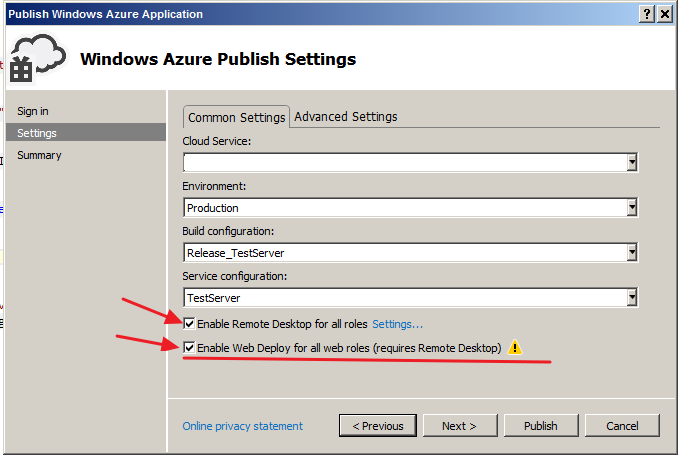 发布此配置后,您就可以设置角色项目的发布设置。注意,CloudCongiguration项目用于包部署,Web项目用于通过deploying部署到Azure,作为部署到正常的Web宿主。