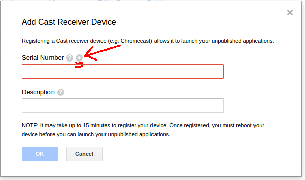 绝对确保在Google开发者控制台中输入的设备串行ID是正确的。当我输入设备的序列号('I‘vs '1')时,我不小心输入了一个错误。最好的方法,以确保是按下这个小图标时,你的设备注册。它将是响亮和清晰的,他们使用的是一种衬线字体,所以你不能混淆像'l‘,'I’和'1‘的东西。
