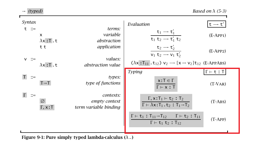 从简单类型的lambda演算中取下来的关键是,类型是在lambda绑定器本身上注释的,每个lambda项都有一个类型。Pierce提供的类型规则是如何机械地检查表达式是否具有良好类型的类型-。类型推断是他在本书后面讨论的一个主题,该主题是从非类型化表达式中恢复类型。