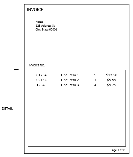 我在创建一个类似发票的报表时遇到了一些问题,报表生成器3.0和VS2012包含一个固定大小的部分,其中将显示详细信息行。此节必须具有固定的大小,以便每个呈现的报表页都能适应特定的空间,而不管项目的数量如何。不适合的项,然后在新的报表页上打印,并重复页眉和页脚。