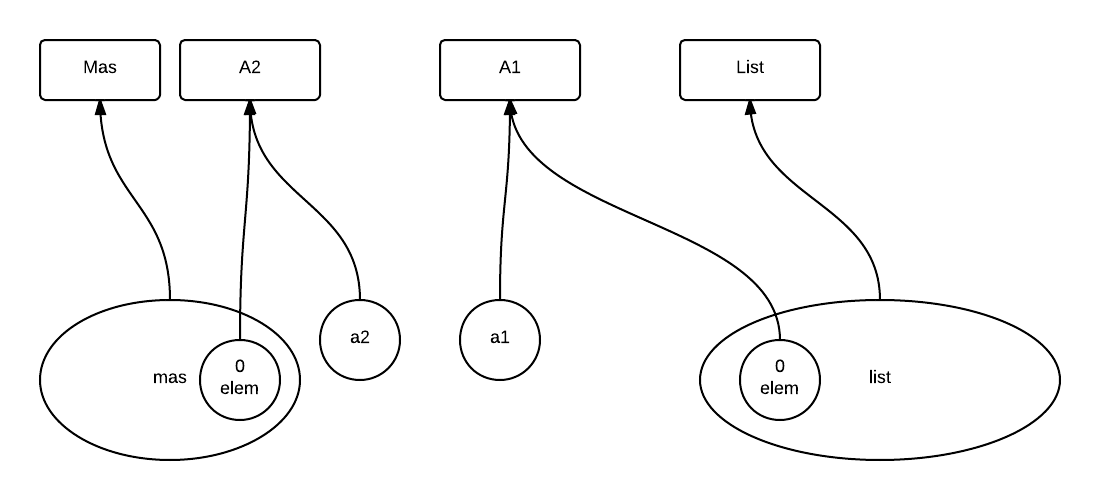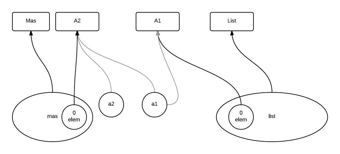 a1持有对A1的引用,a2持有对A2的引用,mas保存对Mas的引用,并且list保存对List的引用。使用了.类