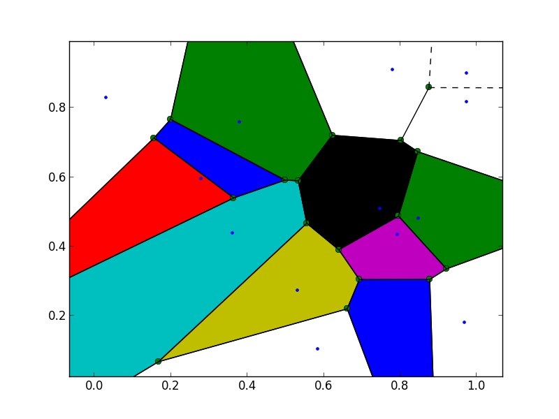 我试图给用scipy.spatial.Voronoi创建的Voronoi图着色。这是我的密码:
