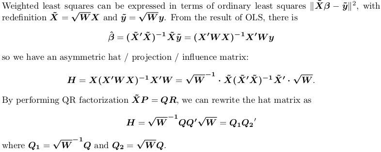 Q <- qr.qy(QR, diag(1, nrow = nrow(QR$qr), ncol = QR$rank))注意,我们没有像在链接答案中那样继续计算tcrossprod(Q),因为这是用于普通最小二乘的。对于加权最小二乘,我们需要Q1和Q2