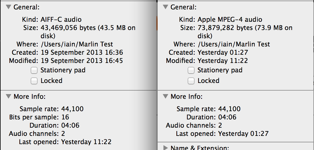 我试图从内存中保存的数据中写入ALAC文件。如果我将文件写为AIFF,则文件为43.5MB。如果我把文件写成ALAC,结果是73.9MB。这两个文件发挥完美,但显然ALAC应该比AIFF小。(顺便说一句,当我使用iTunes将AIFF转换为ALAC时,生成的文件是28‘d,这与我所期望的无损压缩格式大致相同)
