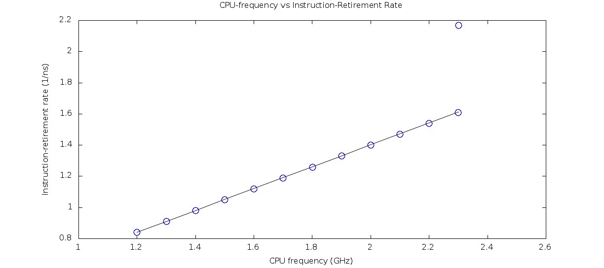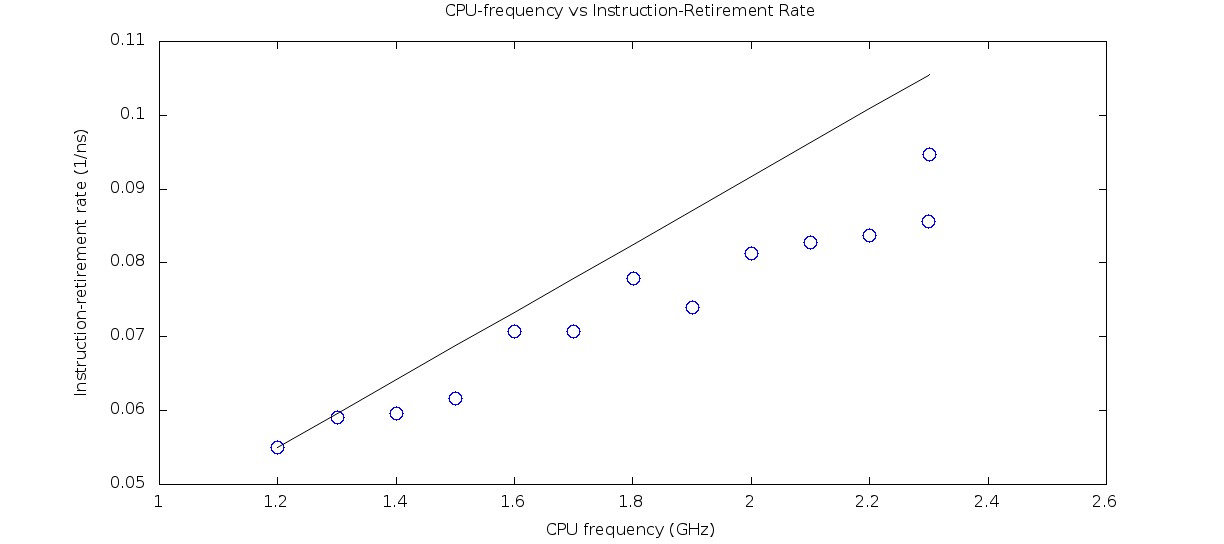 为重复上述实验设置了一个标记。这一行显示了如果指令退休率以与CPU频率相同的速度增长,并通过最低频率标记时,结果将是什么。