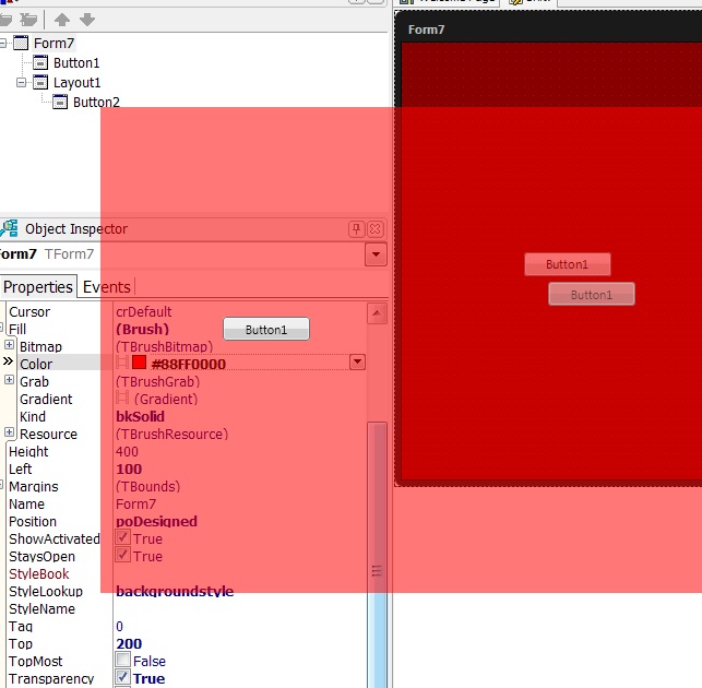 如果您需要使所有组件在窗体半透明,然后将TLayout与Align = alContents放在表单上,并将其Opacity属性设置为所需的值。