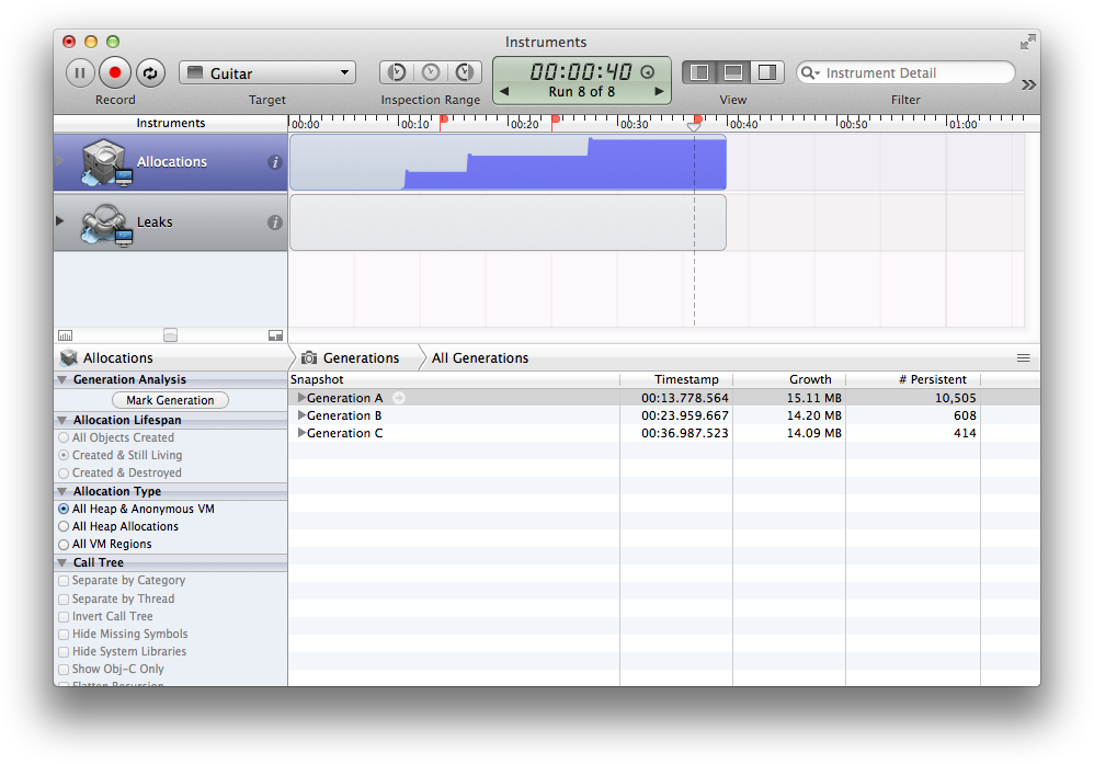 在这篇简介中,我等待应用程序安静下来,点击“标记世代”按钮(由此产生了“A代”,这是我时间线上的第一个标志)。然后我去看了一看,然后就不看了,又做了“马克一代”,得到了“B代”。“增长”栏告诉我,在A代和B代之间,消耗了100 is,但没有发布。但我还不担心这一点,因为可能会有一些iOS内部缓存的UIKit元素。因此,我再重复一次这个过程,以获得“C代”。这很有趣,现在报告的增长率只有8.26kb,这是可以忽略不计的。这个,再加上一个干净的健康证明,从泄密仪器,使我觉得很好的风险,任何严重的记忆问题。