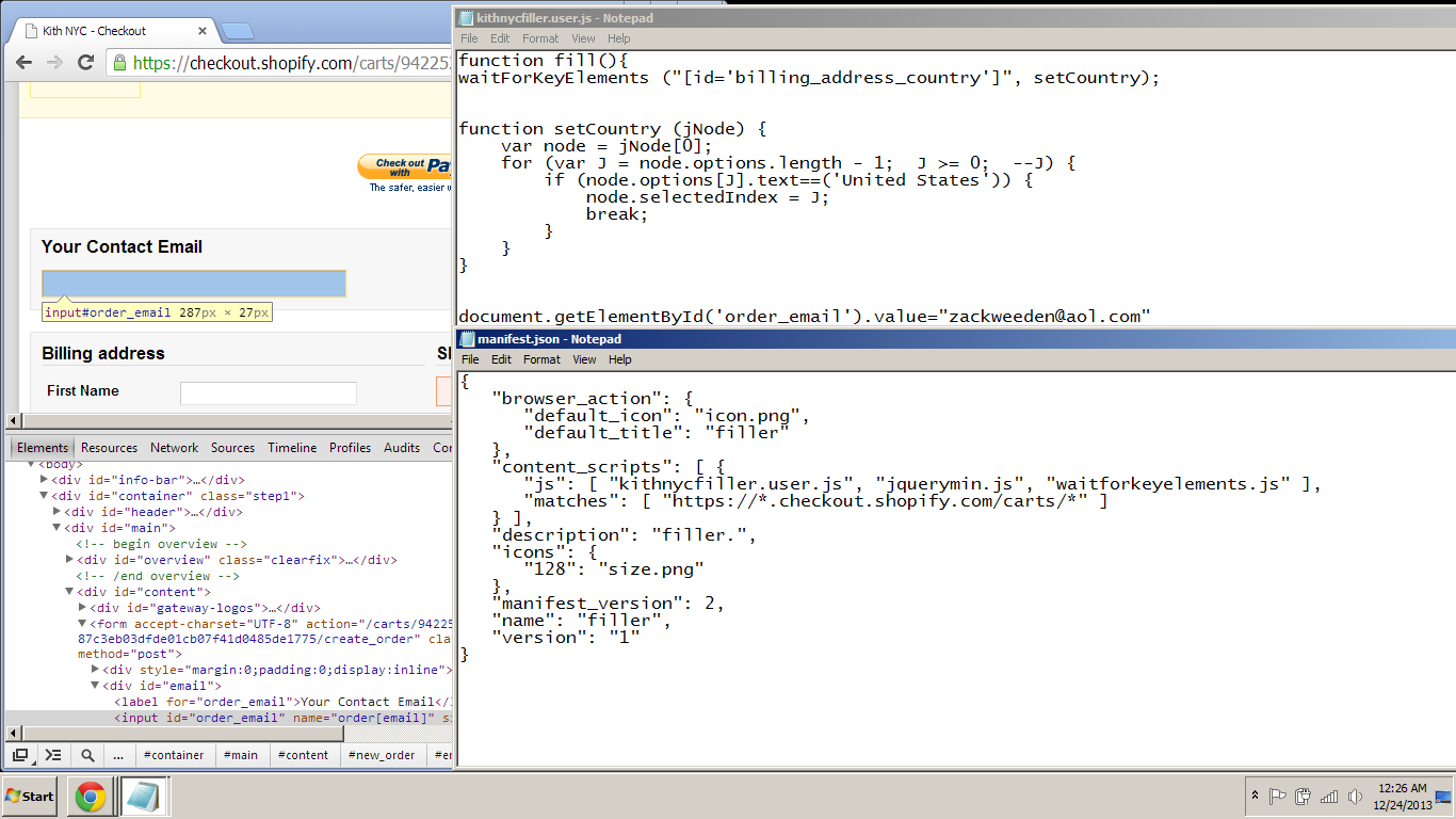 这是我所做事情的一个简单的演示。我只是想让文本字段的值在结帐过程中成为我的电子邮件。我也在展示我在下拉框中选择美国作为国家的逻辑。所有这些都适用于Mozilla的附加功能。