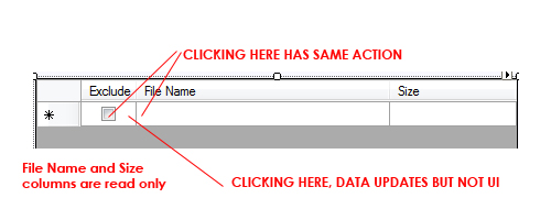 我创建了一个DataGridView控件,其中第一列是一个复选框。当我单击“在复选框中”时,代码将正确执行。但是,当单击发生在单元格中但不在复选框中时,代码将正确处理复选框的状态,但不会更新复选框本身,因此它仍处于单击之前的状态。