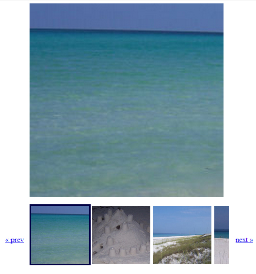 我正在创建像在图片中这样的图片库。它应该有以下选项:当单击缩略图行上的next/prev按钮时,拇指应该移动一个位置,但是移动拇指不应该更改大照片。我用Cycle2实现它,并以这样的方式初始化它: