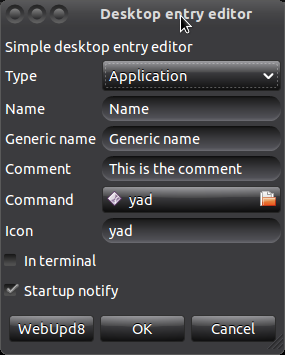 data="$(yad --title="Desktop entry editor" --text="Simple desktop entry editor" --form --field="Type:CB" --field="Name" --field="Generic name" --field="Comment" --field="Command:FL" --field="Icon" --field="In terminal:CHK" --field="Startup notify:CHK" "Application" "Name" "Generic name" "This is the comment" "/usr/bin/yad" "yad" FALSE TRUE --button="WebUpd8:2" --button="gtk-ok:0" --button="gtk-cancel:1")"创建一个对话框,其中包含: