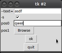 $ cmd_line --input $inputfn --output $outputfn --option1-on --option2-off --option3=42我想我需要写一个简单的XML (YAML?)配置文件,以描述简单的布局和命令行的特殊性(单选按钮,文本字段.)。