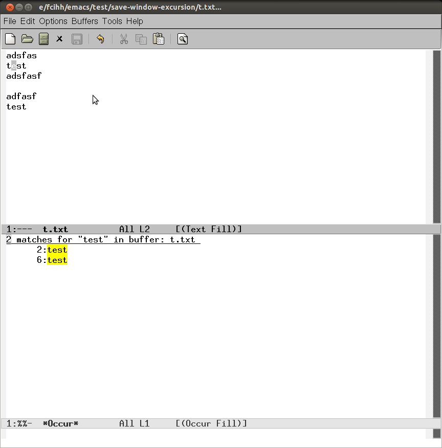 例如,当进入occur模式时,框架分裂为两个窗口,如下所示: